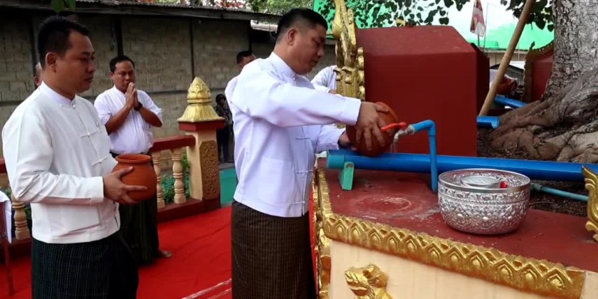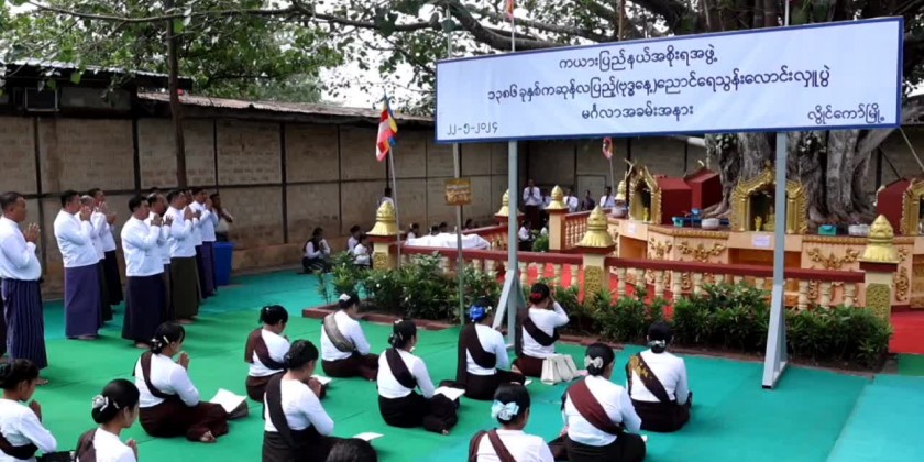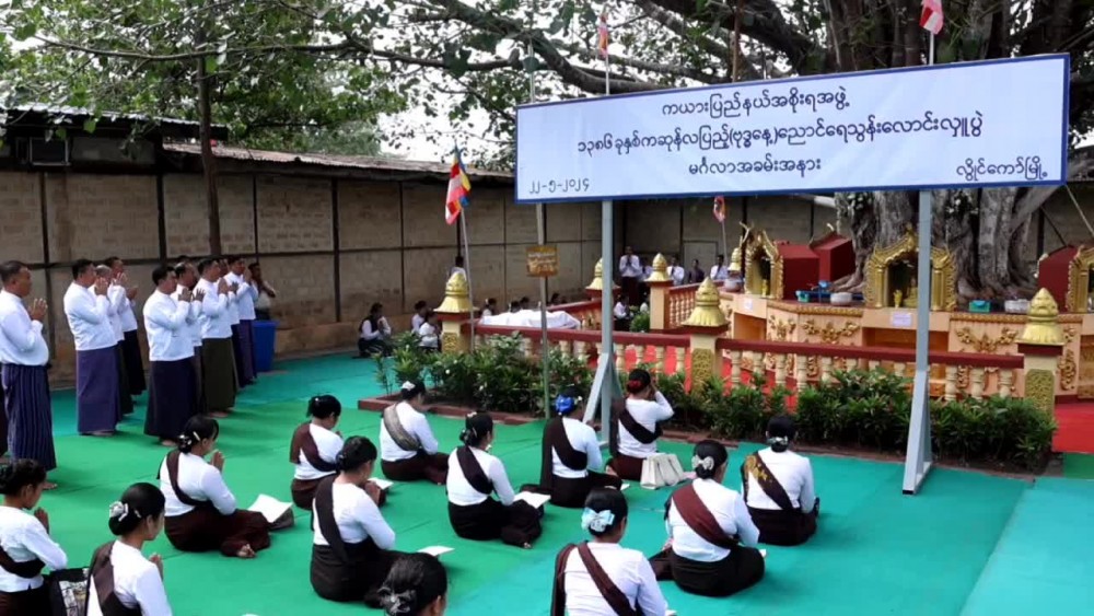 Organized by the Kayah State Government, the ceremony of Buddha Day which falls on full moon day of Kasone and related ceremonies such as consecration ceremony for the Buddha Image, ceremony of pouring water to the Bodhi tree and offering dry provisions to the members of Sangha was held at Myonan Pagoda and SasanaBeikman in Loikaw Township in the morning on 22nd of May. First, the 11 members of Sangha performed the consecration ceremony of the Myonan Pagoda.