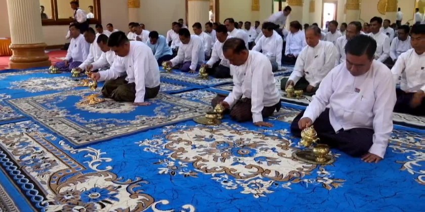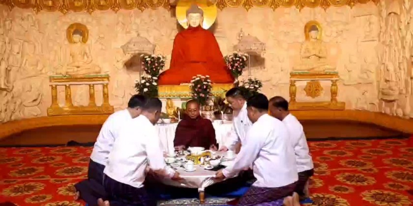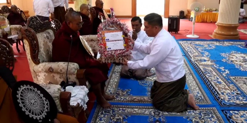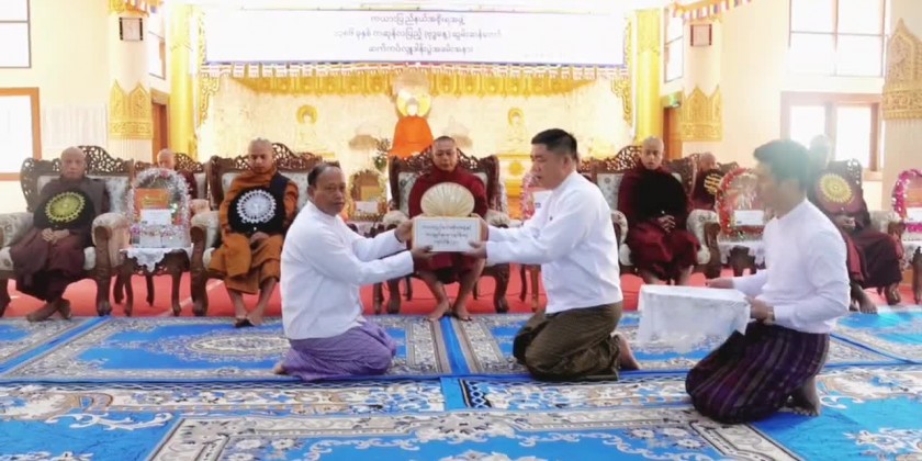At the ceremony of offering rice provisions to the members of Sangha and nuns from the monasteries in Loikaw Township, the Chief Minister U ZawMyo Tin, Commander of Regional Military Operation Command, members of State Government and invited guests observed five precepts administered by the Presiding Sayadaw of DhammaGonyi monastery Baddanta Dhammawudha, took the ParittaSuttas recited by the members of Sangha, offered the offertories and cash donation to the Sangha, shared the merits gained and offered the day meal to the members of Sangha.