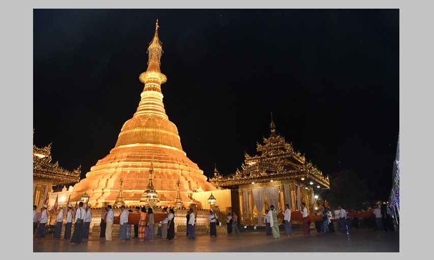 Yangon Region Chief Minister U Soe Thein and many other officials as well as Buddhist devotees offered the Non-Stale Golden Lotus Robe to the Botataung Kyaik De Att Pagoda on Monday, the full moon day of Tazaungmon. Also, an awarding ceremony for the Robe-weaving competition was held at the Pagoda. The Chief Minister and party offered the Golden Lotus Robe to the Shwedagon Pagoda.