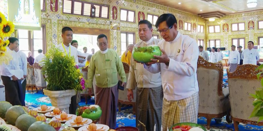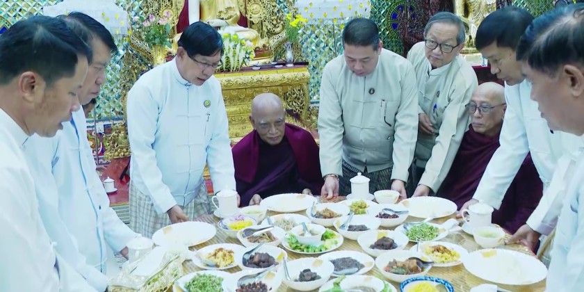 After the ceremony, the Yangon Region Chief Minister, the Deputy Minister, Region Government Ministers, Trustee Board members, and donors offered the day meal to the members of Sangha at the Seikpan Workers' Multi-Purpose Dhamma Hall on the pagoda platform.