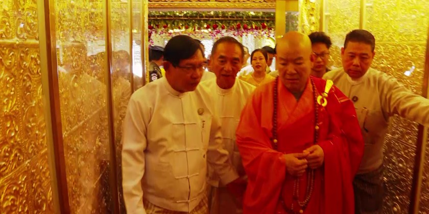 First, Venerable Van Shichang Zang from the Ling Guang Si Monastery in Beijing, People's Republic of China, Yangon Region Chief Minister U Soe Thein, Deputy Minister for Religious Affairs and Culture U Aye Tun, Region Minister for Social Affairs U Htay Aung, Chairman of the Myanmar-China Friendship Association (Central) U Tin Oo, and rotating Chair of the Pagoda Board of Trustee Dr. Tin Tun jointly cut the ribbon to inaugurate the security glass enclosures and the polycarbonate installations.