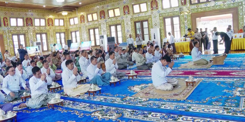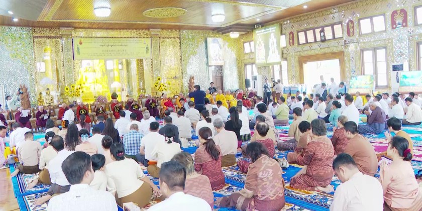 They then sprinkled scented water on the security glass doors and toured the area. Subsequently, the merit-sharing ceremony continued at the Nan-U pagoda prayer Hall and the attendees received the Five Precepts from the Chairman Sayadaw of the State Sangha Maha Nayaka Committee.