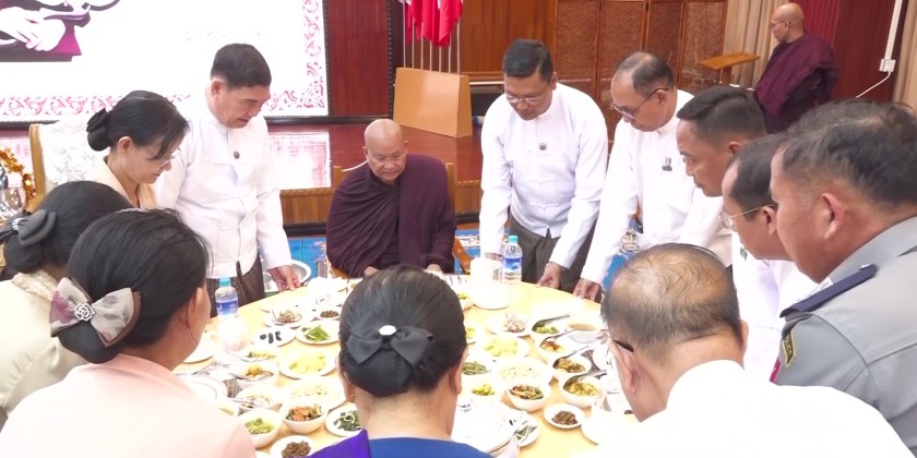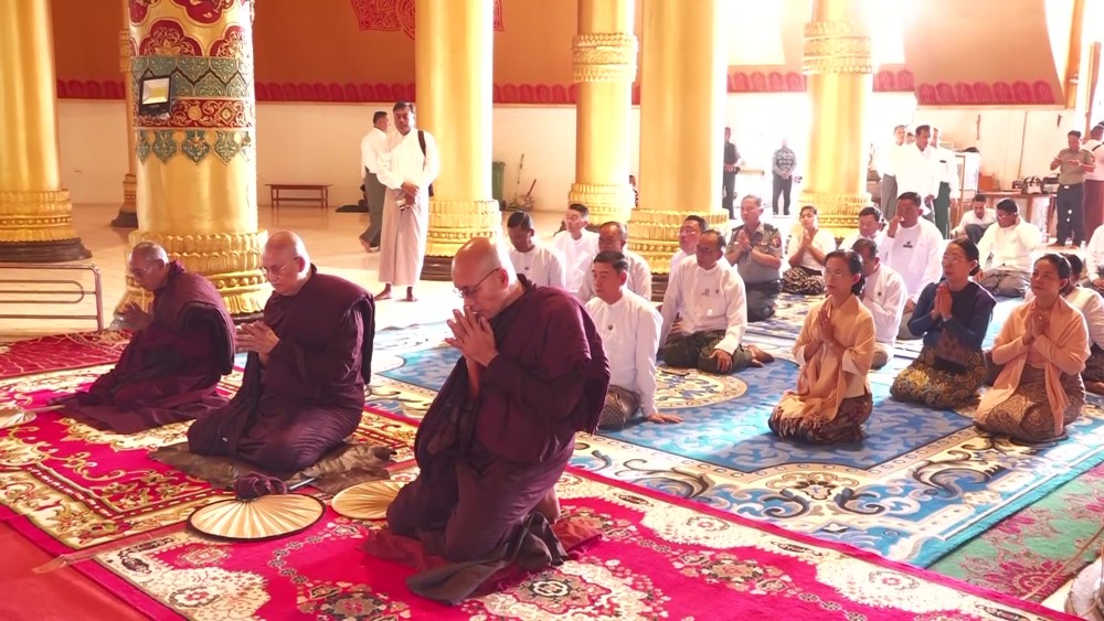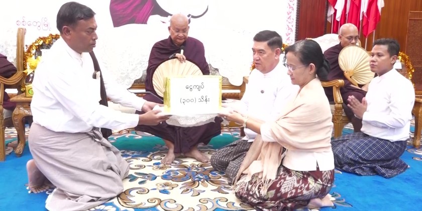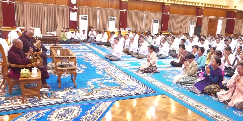 Later, the donation ceremony resumed at the state government meeting hall, where the Chief Minister and attendees offered day meals and donations to the Myauk-U Sayadaw and the Sangha. During the ceremony, the Chief Minister and the audience took the Five Precepts administered by Myauk-U Sayadaw.