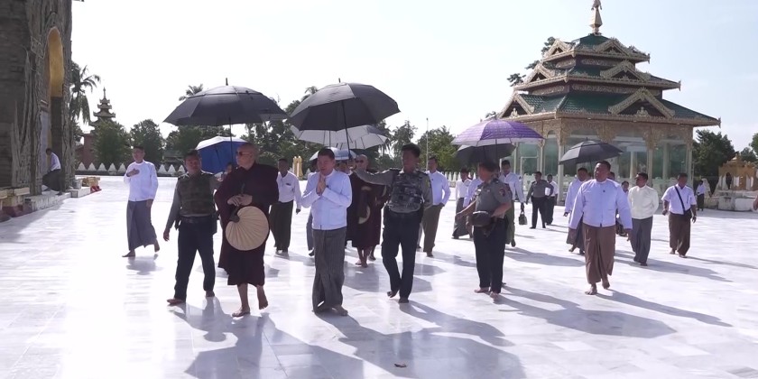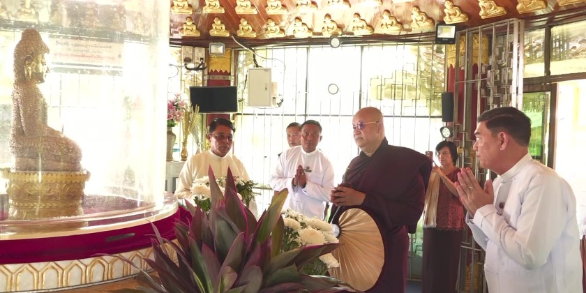 First, the Chief Minister, along with his wife and members of the state government, joined with the congregation led by the Myauk-U Sayadaw to offer flowers, oil lamps, and water as homage to sacred Buddha images resided within the Lokananda Pagoda in Sittwe.