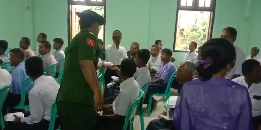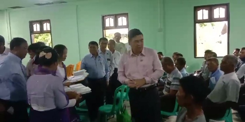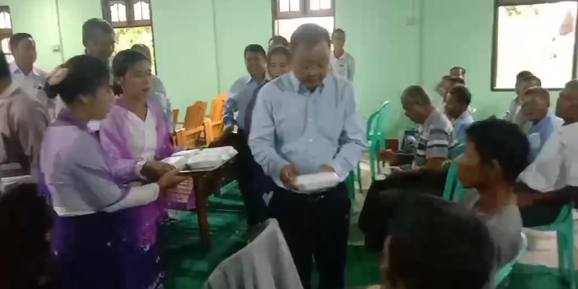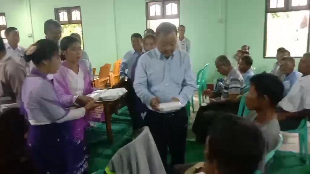 The charity feast went to the Fire brigade, Sittwe military station, Buddhist monasteries and other religious places, Nursing and Midwife Training School, volunteer groups, orphanages including Border Area National Races orphanage, departmental personnel who are carrying out the rehabilitation works, technical training school and computer university renovation volunteer groups, philanthropic centers, the ceremony of handing over paddy seeds, the residents from The Chaung Bangali village and Kha Wa Di village in the morning and U-Yin-Tha village, Ma Gyi Myaing , Sat Yon Su , Chaung Nwe , Kyaung Gyi Lan wards, and Kyay Taw , The Chaung, Dar Paing and Bu May villages in the evening.