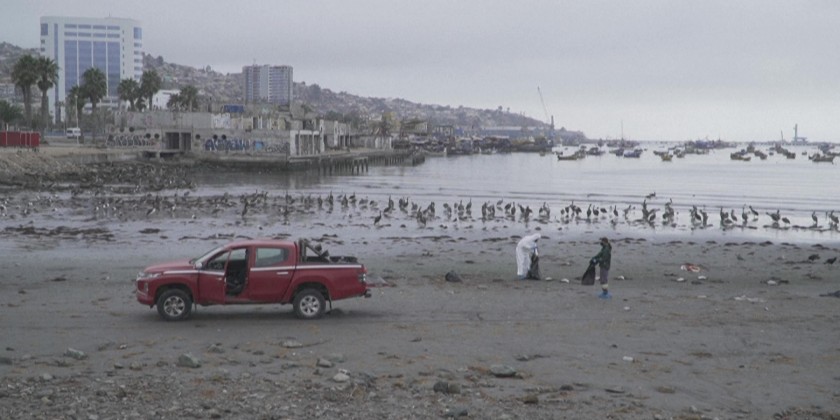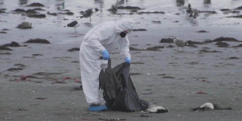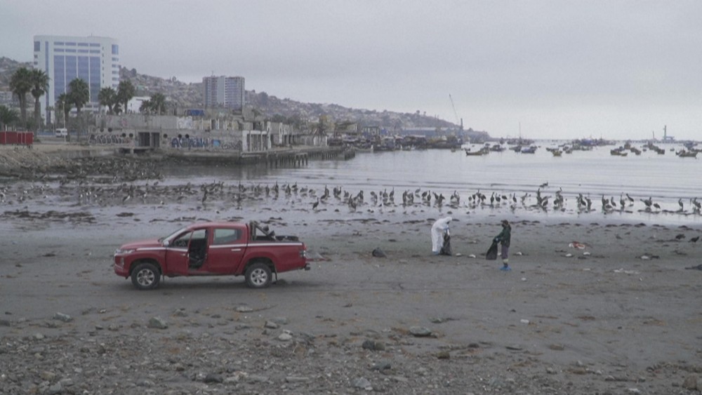 Chilean employees of the Agricultural and Livestock Service collect hundreds of dead seabirds from a beach, near the coastal port of Coquimbo. Early tests indicate that the recent mass death of 3,500 Guanay cormorants along Chile's northern coast were not caused by avian flu, authorities say.