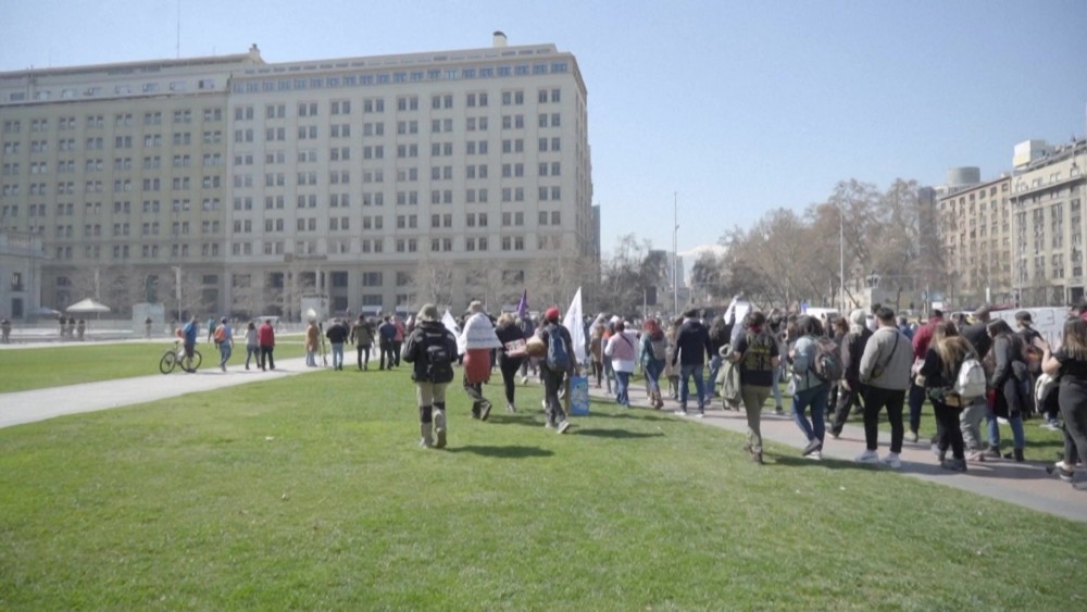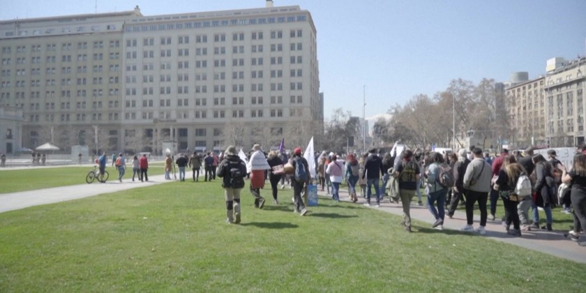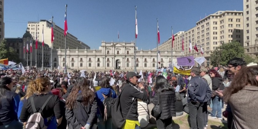 Hundreds of teachers protest outside Chile's La Moneda presidential palace and the Education Ministry in the capital Santiago to demand pay hikes and a change to the country's educational model, as the teachers union announces the launch of an "indefinite national strike."