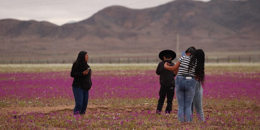 The Atacama Desert, in northern Chile, is currently covered in a colorful proliferation of flowers, generating a breathtaking scenery. The phenomenon, known as the "flowering desert," occurs in certain years when rainfall and temperatures coincide, awakening the desert's dormant seeds.