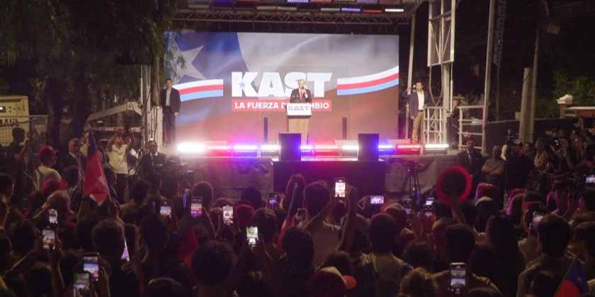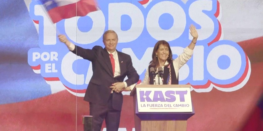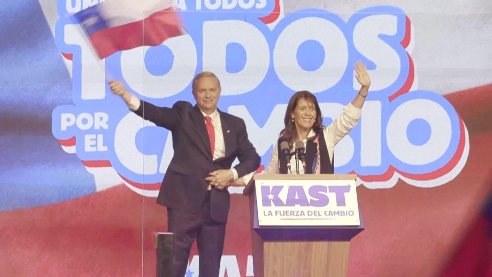 Chile's far-right leader Jose Antonio Kast celebrates with supporters after first round of voting as he will head-to-head with leftist former labor minister Jeannette Jara in a presidential run-off. With more than 70% of votes counted, Kast had secured about 24% of the vote in Sunday’s first round vote, having campaigned on hard-line promises to crack down on crime and immigration.