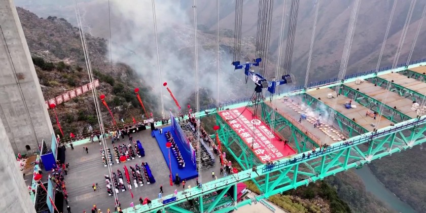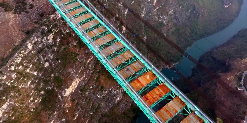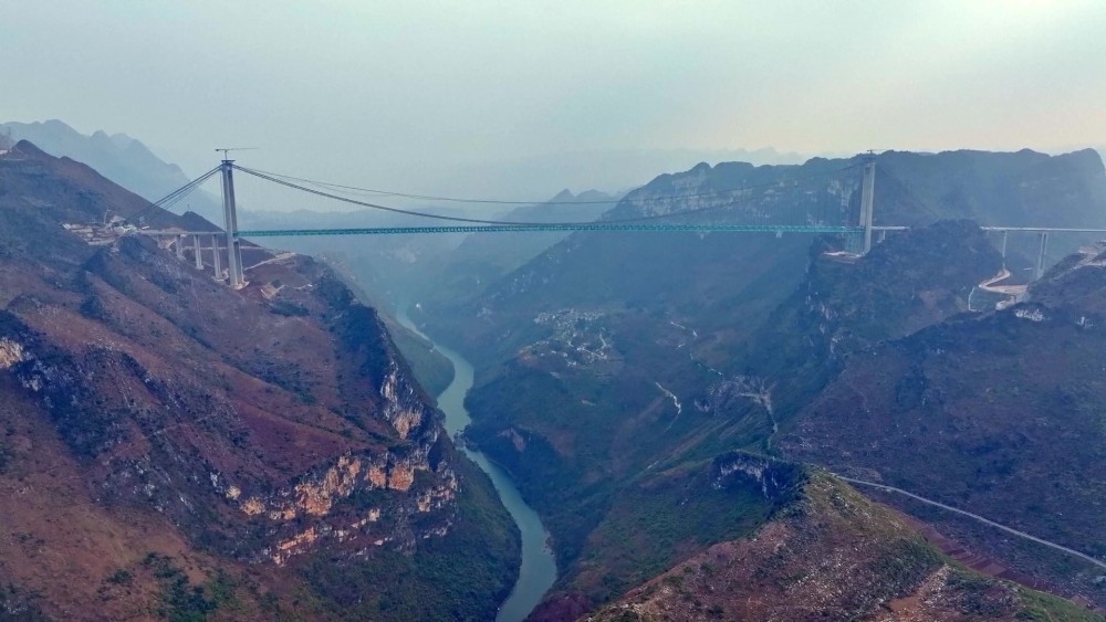 A project of Guizhou Transportation Investment Group Co., Ltd., the suspension bridge has a vertical height of 625 meters from the bridge deck down to the river surface roughly twice the height of the Eiffel Tower. The 2,890-meter bridge, with a span of 1,420 meters, is also the world’s largest span bridge to be built in a mountainous area.