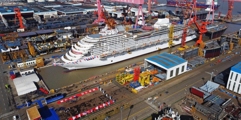 Jointly designed and built by the CCTD and Shanghai Waigaoqiao Shipbuilding Co. Ltd., the cruise ship, measuring 323.6 meters in length with 135,500 tonnes, can accommodate up to 5,246 passengers.