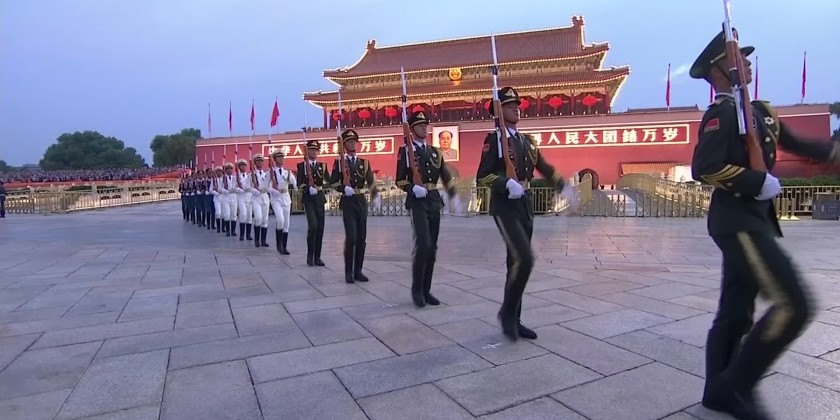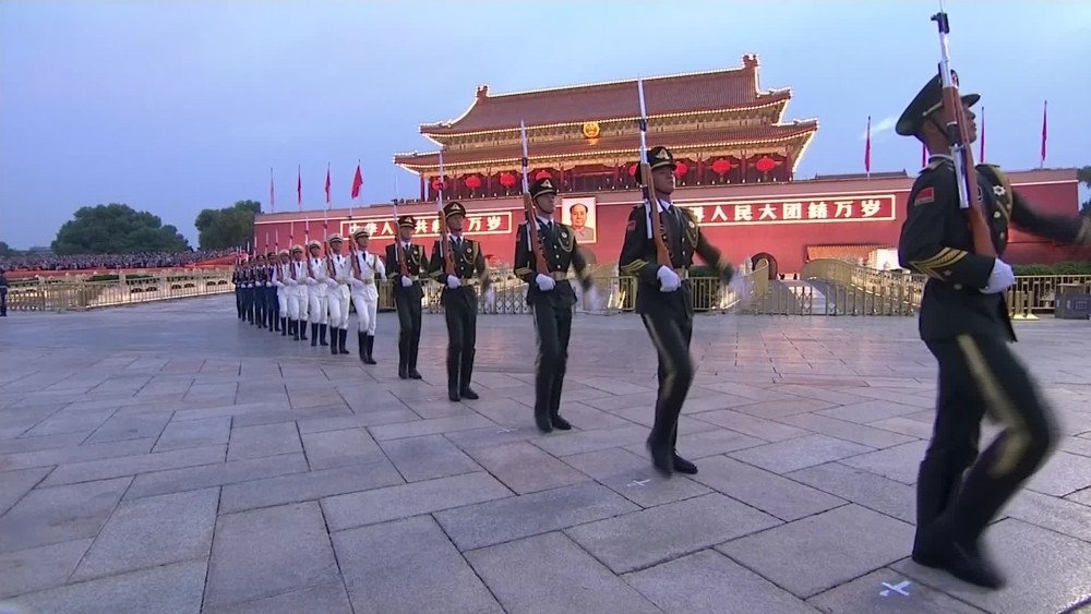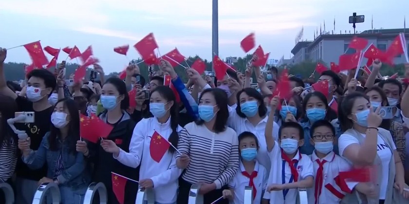 Spectators, wearing masks, watched the flag being raised in accordance to the sunrise and sang the national anthem. On Friday, President Xi Jinping and other top leaders attended a ceremony in the square paying tribute to those martyred in the struggle to establish the state.