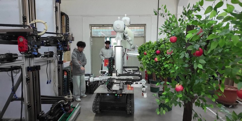 This robotic system consists of two semi-humanoid robots, one tall and one short, operating on a shared tracked base. They are currently participating in picking training within a simulated orchard laboratory at the university. The taller robot, named Big Guy, is designed to pick apples hanging over 1.5 meters high, while the shorter one, Little Guy, focuses on harvesting lower-hanging fruit.