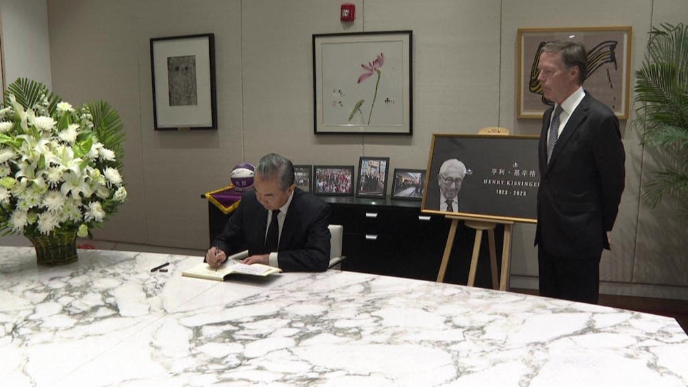 Chinese Foreign Minister Wang Yi signed a book of condolences for former US Secretary of State Henry Kissinger at the US embassy in Beijing. China and the United States, as two major nations, should and must coexist peacefully, Wang Yi made a remarks on the late US diplomat.