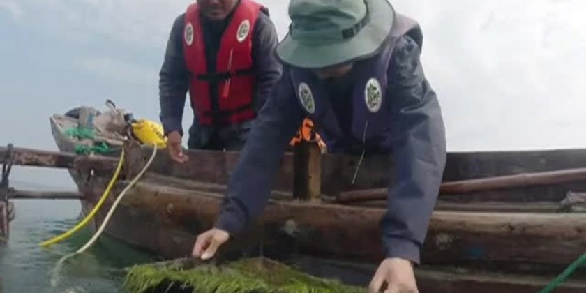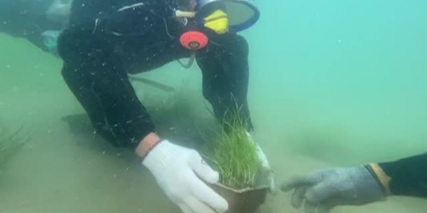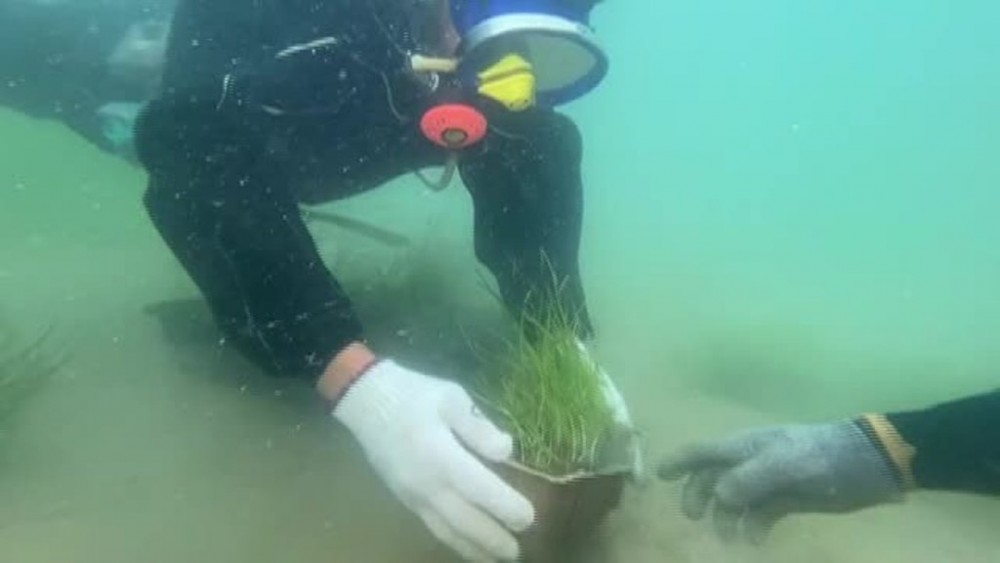 Recently, some Chinese divers have taken pallets full of seagrass seedlings down into the deep sea and planted them on the sea bed for seagrass restoration in the waters near Dongchu Island, Shandong Province, in China.