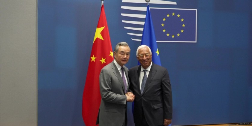 Chinese Foreign Minister Wang Yi and European Council President Antonio Costa in Brussels, Belgium, on Wednesday, pledging to uphold multilateralism and strengthen cooperation.