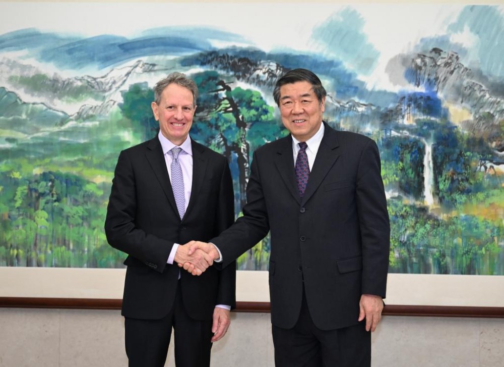 Chinese Vice Premier He Lifeng met with former U.S. Secretary of the Treasury Timothy Geithner, now chairman of Warburg Pincus on Thursday in Beijing.