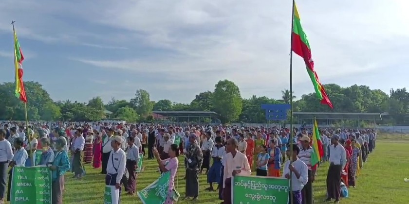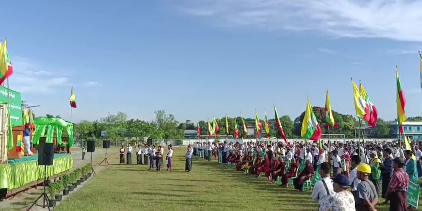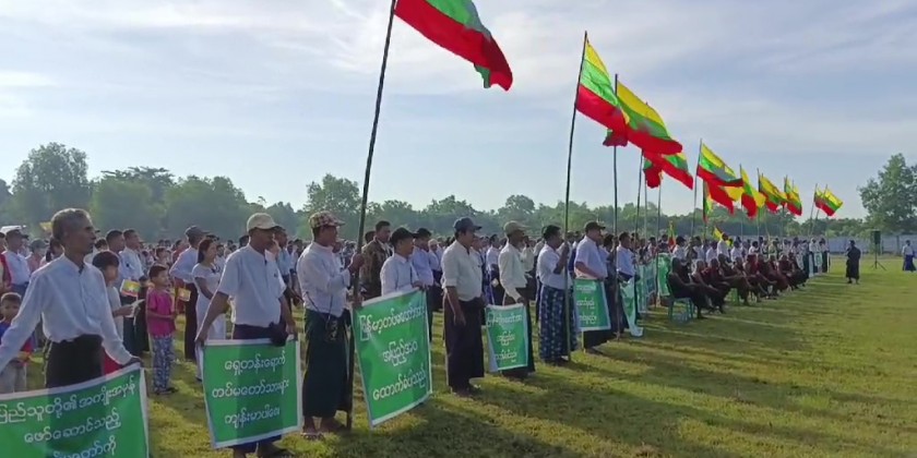 On Thursday, peace advocates in Bago Township gathered at the Utta  Football Ground to condemn the actions of various terrorist armed insurgent groups, including the KIA, TNLA, MNDAA, AA, BPLA, and PDF.