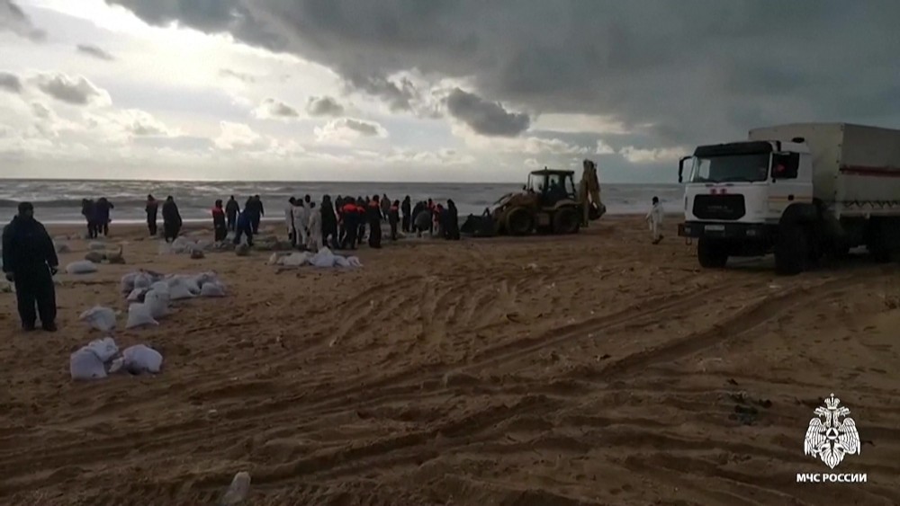 Russian volunteers and rescuers continue to clean up beaches off the coast of southern Russia after an oil slick from two damaged tankers this month may have polluted up to 200,000 tonnes of soil.
