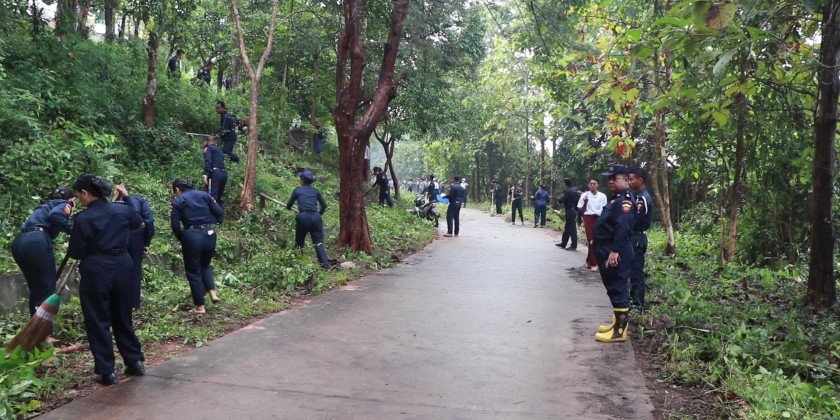 Officials, police, firefighters, and local residents worked together to clear bushes, collect trash, and tidy up the area around pagodas and rest spots to make the site peaceful and pleasant for visitors. The Chief Minister urged residents to help keep the area clean, avoid littering, and maintain discipline.