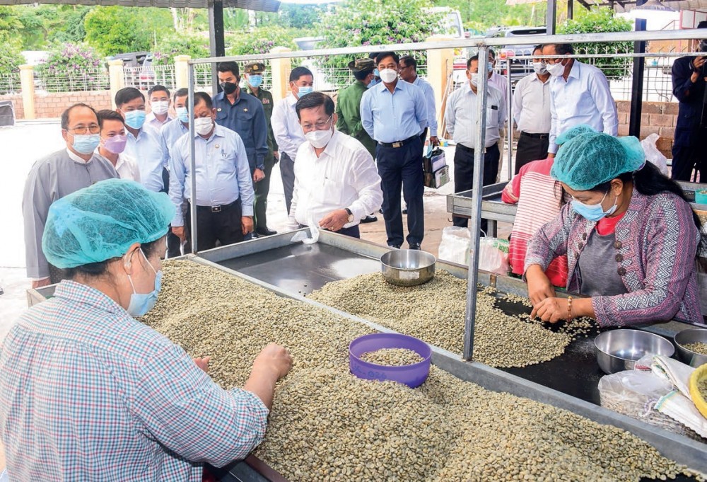 The Prime Minister urged to penetrate Myanmar coffee brand to the international market, and pledged to provide the needs for development of coffee industry. The Prime Minister and party later viewed the coffee quality testing at the lab, and production process of Mandalay Coffee Group Factory.