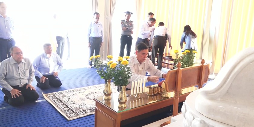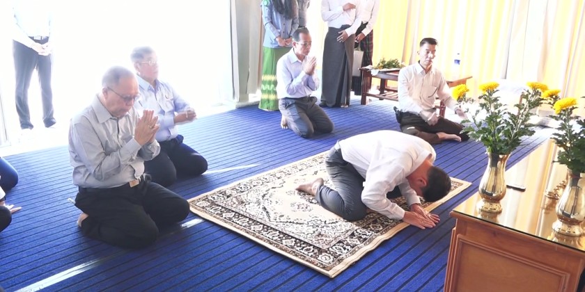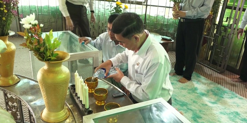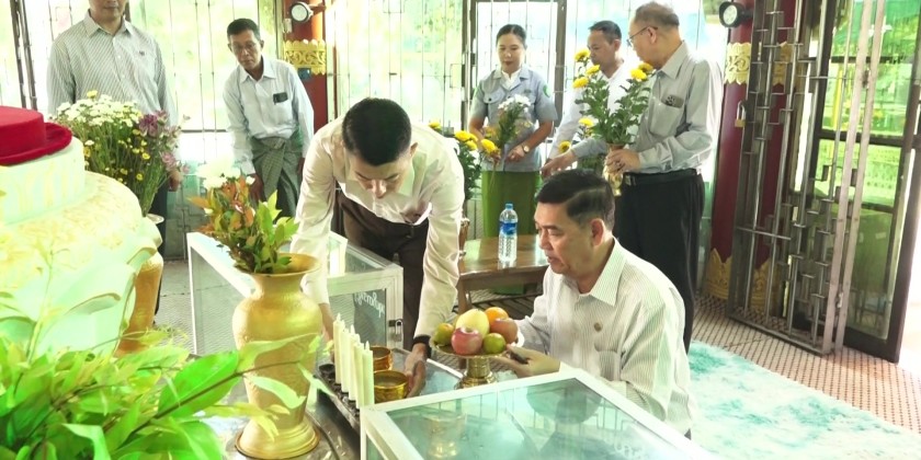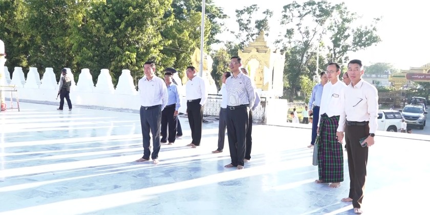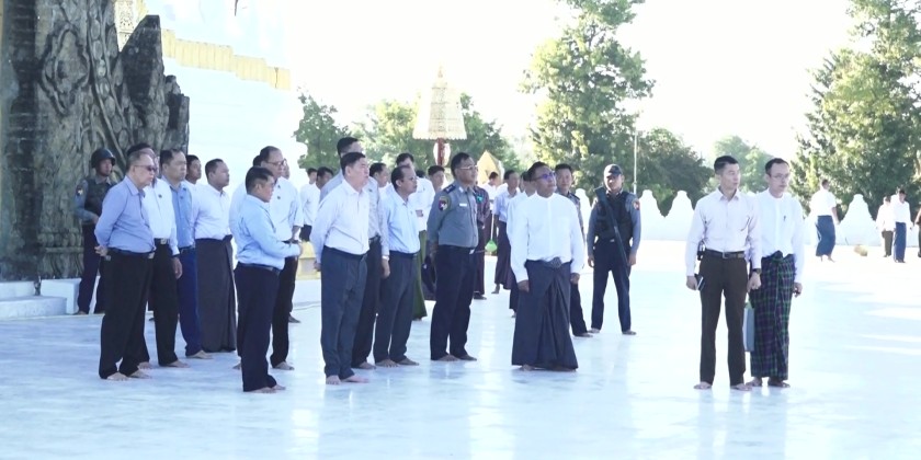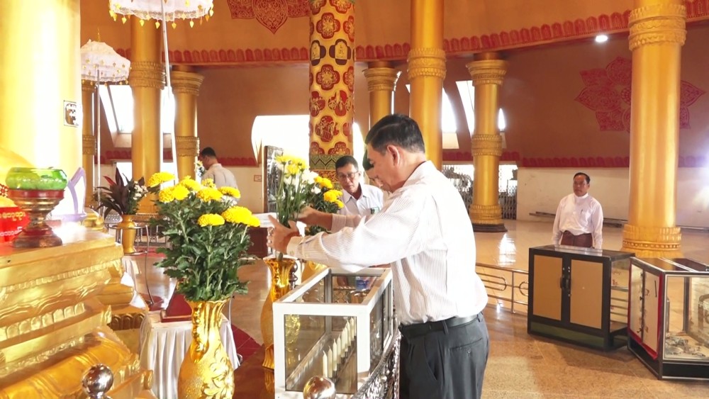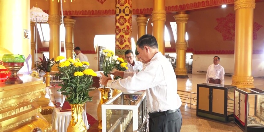 First, the Chief Minister and officials paid homage to the sacred Buddha statues inside the Lawkananda Pagoda and offered flowers, water, and oil lamps to the Maravijaya မာရဝိဇယ and Abhaya Rajamuni အဘယရာဇမုနိ Buddha Images placed at the precinct of the pagoda.