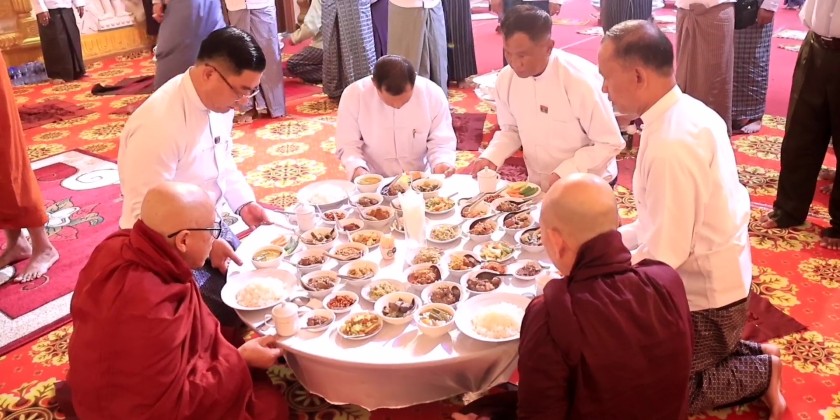 The event began with the congregation receiving the Five Precepts from the Principal Sayadaw of abbots training school, followed by the reciting Paritta Suttas by the sangha. After that, led by the Chief Minister, the guests respectfully offered the offertories to the members of Sangha, listened to sermon, and performed the sharing the merits of their donations. Subsequently, the Chief Minister and officials also offered alms to the members of Sangha.