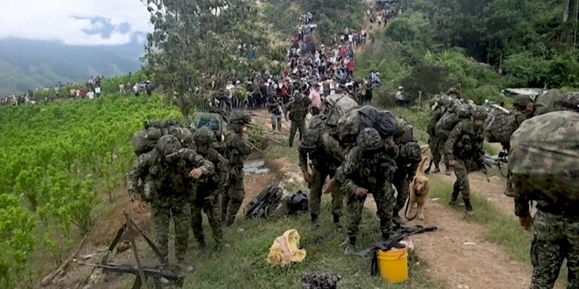 They walk towards the nearby town of El Plateado, where a commission from the state Ombudsman's Office and United Nations receive them. The government said that the officers were being held by a dissident FARC guerrilla group.