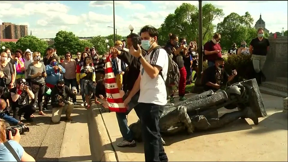 KSTP reports that law enforcement was on the scene but did not intervene to prevent the statue from coming down. The station says the bronze statue was gifted to the state by Italian-Americans and has stood at the State Capitol since 1931.