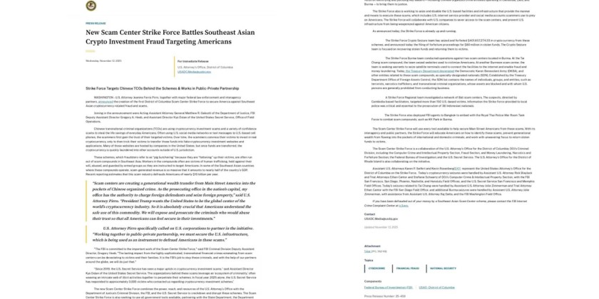 Strike Force (SCSF) to protect the US against telecom fraud schemes. When the announcement was examined, it’s found that it states the strike force was established to safeguard the United States from cyber-fraud activities, including cryptocurrency-related scams, based mainly in Southeast Asian countries.