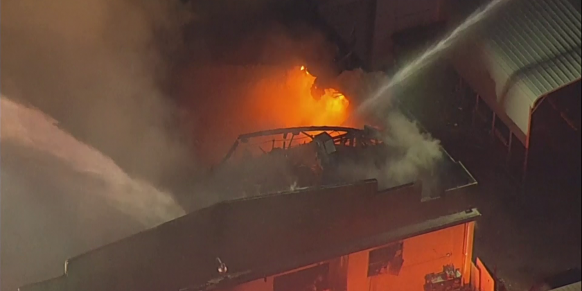 The fire burned through the structure with heavy flames and smoke rising from the blaze. The fire destroyed a bar in the building in the community of Antioch east of San Francisco.