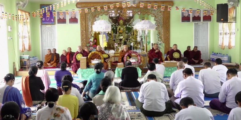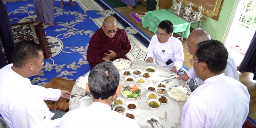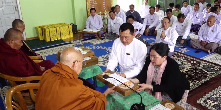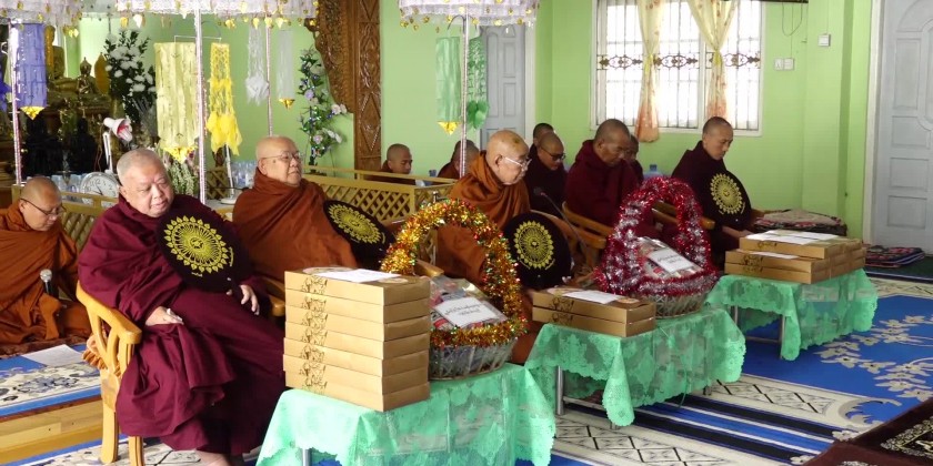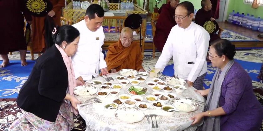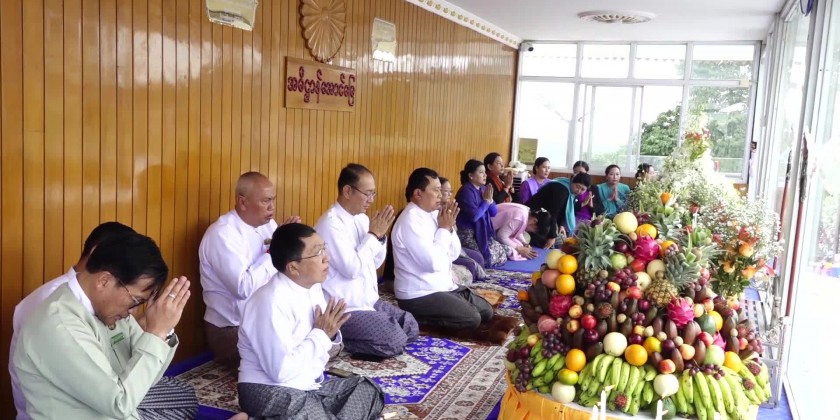 First, the Chief minister and members offered the flowers, water, candle light and fruits to the Shwe Phone Pwint pagoda and attended the ceremony for the achievement of five days uninterrupted reciting Mahapathana Dhamma discourses. The congregation led by the Chief Minister observed the five precepts administered by the presiding Sayadaw of Sun Lun Gu KammahtanKyaung Taik monastery, took the Paritta Suttas recited by the members of Sangha and sermon delivered by the presiding Sayadaw of Thein Taung (သိမ်တောင်) monastery, shared merits gained and offered ‘Soon’ day meal to the members of Sangha.