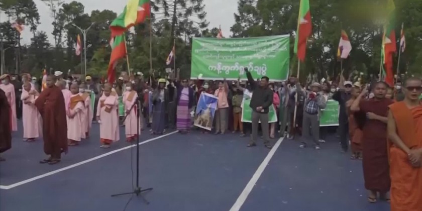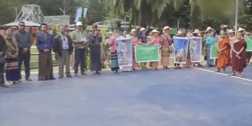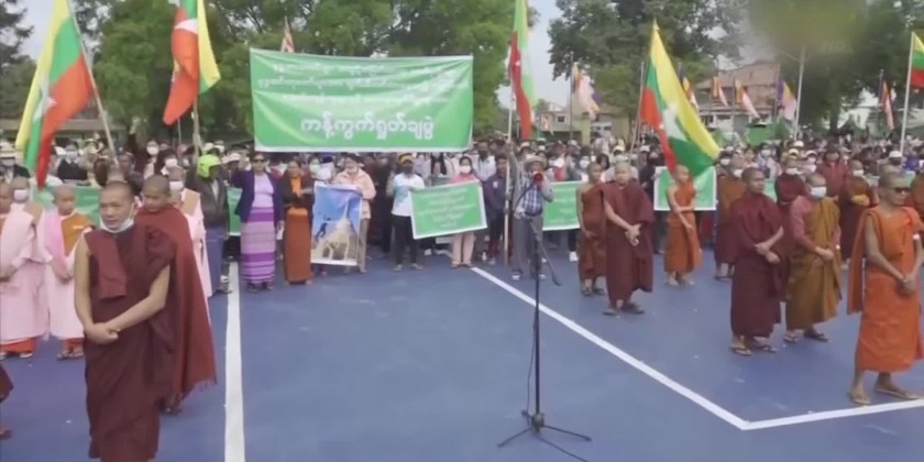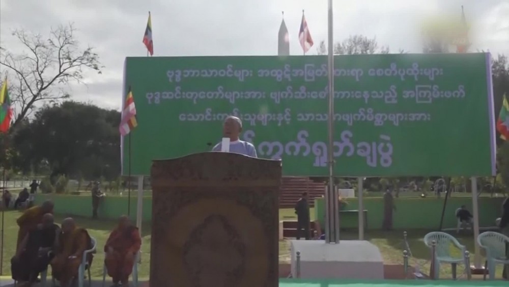 In this condemnation at the Independence Park in Lashio, members of the Sangha, nuns and town elders spoke out against what was being done to destroy Buddhism. And, the attendees chanted slogans condemning the act of terrorists destroying pagodas and religious buildings.