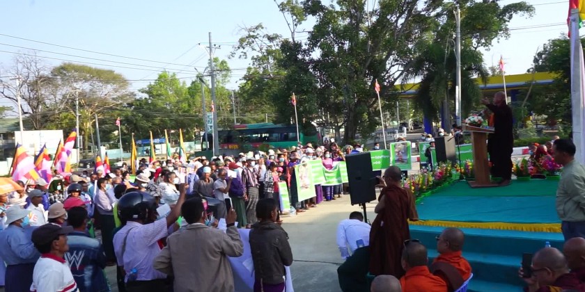 The mass rally of condemnation, first, gathered at District People’s Sports Ground and the march was started from MyaukHleKauk roundabout led by the Sayadawgyi, monks and lay persons altogether about 400 participants to the Minbu U Awbatha Township Hall peacefully by shouting the slogans and holding vinyl posters.