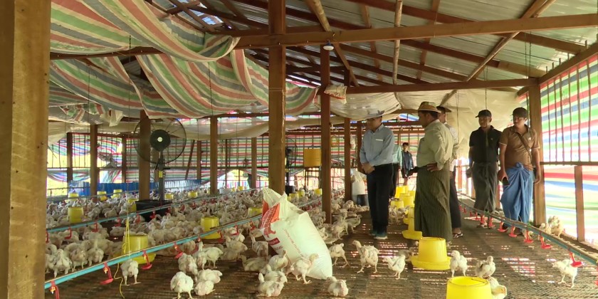 The Chief Minister and officials then toured and inspected a farm owned by U Thein Win, observing the breeding of over 6,000 broiler chickens in a completed facility and the construction of a new, expanded chicken farm.