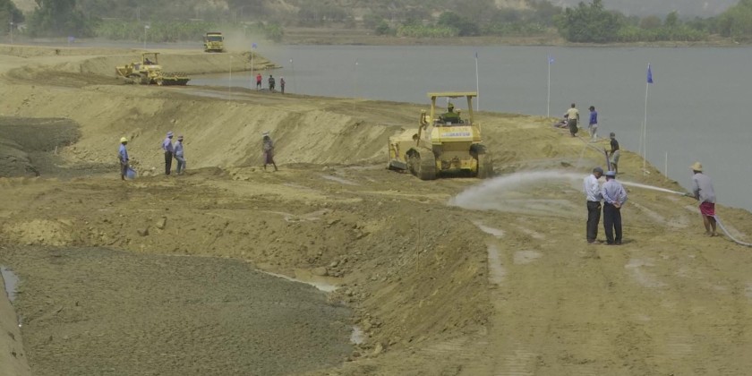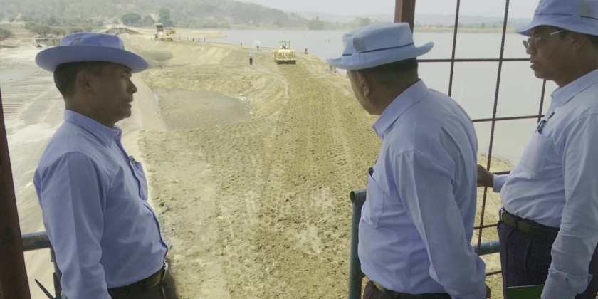Near Mezali Kyin Village in Tatkone Township, the Department of Water Resources and Irrigation Management is intensively repairing the Hsin Thay Weir (Dahat Kone Dam) which regulates water flow from the Sin Thay Reservoir using heavy machinery.