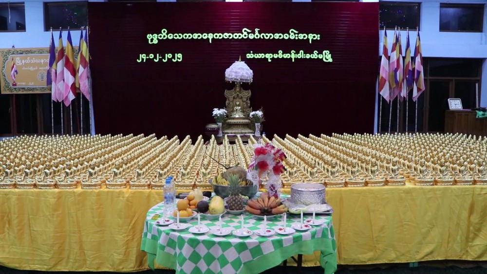 Union Minister for Immigration and Population, U Myint Kyaing, together with responsible officials and local elders, attended the ceremony for the consecration of 1,000 Buddha images made of multi-flowers, held on December 24 at the ThangaramaBeikman Hall in Wakema Township, Ayeyawady Region.