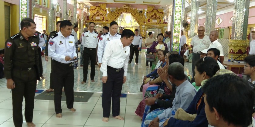 They then listened to a sermon, shared the merit of their donations and offered early meal to the Sangha. Next, the Union Minister proceeded to the Relic Pagoda in Kyonmange  Town, Wakema Township, where he toured the arches within the pagoda precinct where the staff from the Wakema Township Office of the Ministry of Immigration and Population were providing services under Phase (3) of the Pan Khin Project, including household registration and the replacement of damaged or lost Citizenship Scrutiny Cards (CSCs) for local residents, as well as processing applications for CSCs for citizens who had reached the age of 18.