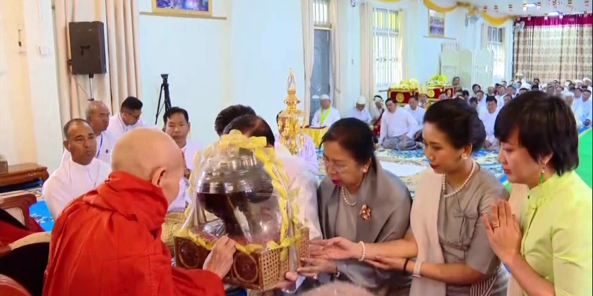 Then, the Prime Minister and wife, and party offered Diamond Bud and religious items to the Pahtama Mine Thout Pariyatti Sar Thin Teik presiding Sayadaw and members of the Sangha, along with the offertories.