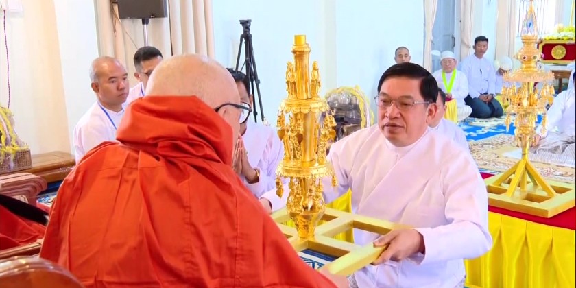 Then, the ceremony commenced with three times recitation of Namosata, and the congregation led the by the Prime Minister and wife received 9 precepts administered by State Ovadacriya, Pahtama Mine Thout Pariyatti Sar Thin Teik presiding Sayadaw, and listened to the sermons delivered by members of Sangha. This was followed by the perfoming of religious rituals.