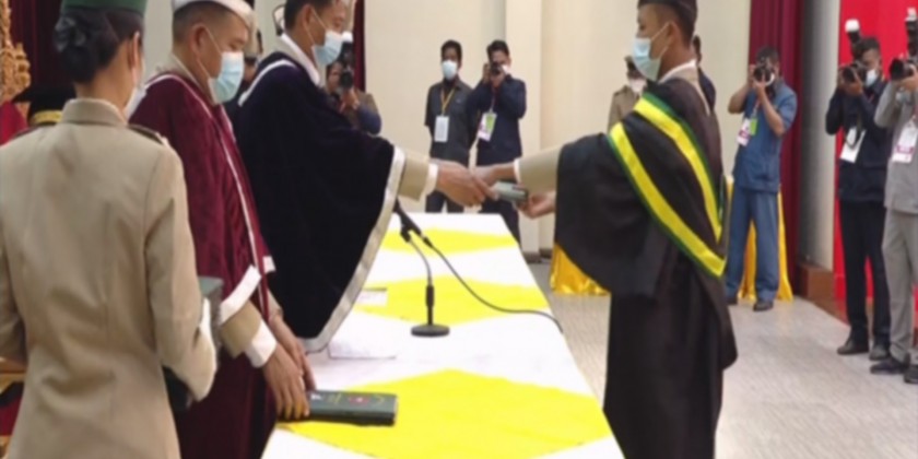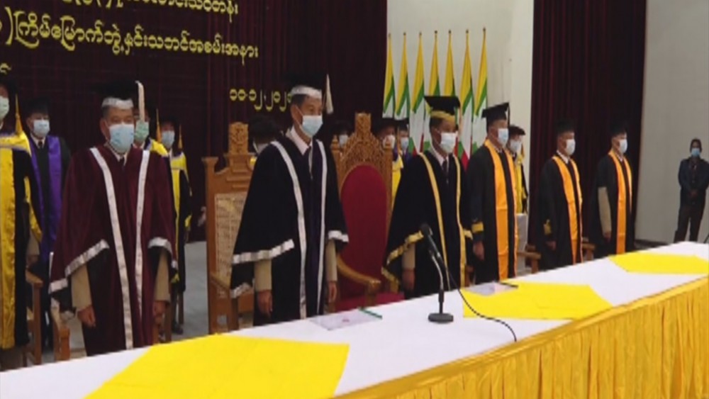 First, the Acting Rector Lt-Col. Myint Win and members of the dean of faculties entered the Convocation Hall and took their seats. The convocation ceremony was opened with playing the National Anthem. Then, the acting rector announced the convocation ceremony and urged the graduates to adhere to the code of conduct for them.