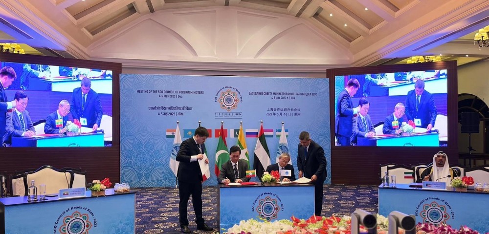 The memorandum on granting the Republic of the Union of Myanmar the status of a dialogue partner of the Shanghai Cooperation Organization (SCO) was signed by U Moe Kyaw Aung, Ambassador of Myanmar to the Republic of India, and Mr. Zhang Ming, Secretary-General of the Shanghai Cooperation Organization on 5 May 2023, at the sidelines of the Meeting of SCO Council of Foreign Ministers (CFM) at Goa, India on 4-5 May 2023.