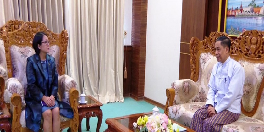 Union Minister for International Cooperation U Ko Ko Hlaing received Ms. Noriko Takagi, UNHCR Representative to Myanmar on Tuesday at the Ministry of International Cooperation in Nay Pyi Taw.