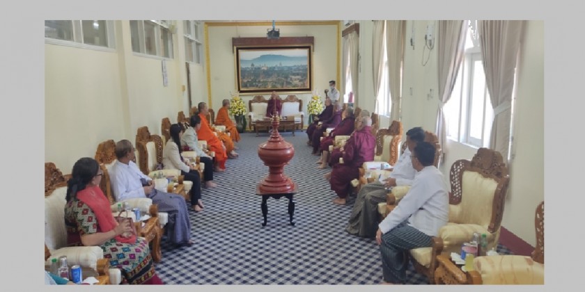 The vice-rector Sayadaw Prof. Dr. Phramaha Surasak from the Maha chulalongkorn rajavidyalaya University of Thailand paid a courtesy call to the Rector Sayadaw of International Theravada Buddhist Missionary University Aggamahapandita MahaDhammaKathika Bahujanahitadhara Dr. Baddanta Chekinda at the Bagan Hall of the Central Building of the University at 2 PM on 19th February.