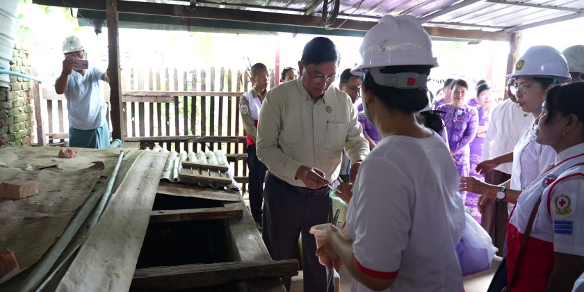 As part of the ongoing public health awareness and vector control campaigns to prevent dengue fever which is commonly occurring during the monsoon season in various townships of Magway Region, the Chief Minister U Tint Lwin, along with region ministers and departmental officials at the regional, district, and township levels, visited neighborhoods in Magway city to inspect these efforts by treating water containers with abate larvicide.