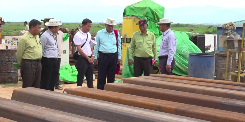 On April 20 at 1:30 PM, the Chief Minister and officials inspected machinery, construction materials, sheet pile driving equipment, purified water distribution for drinking, and relief supplies at the hotel zone jetty in Nyaungshwe Township, Kalaw District.