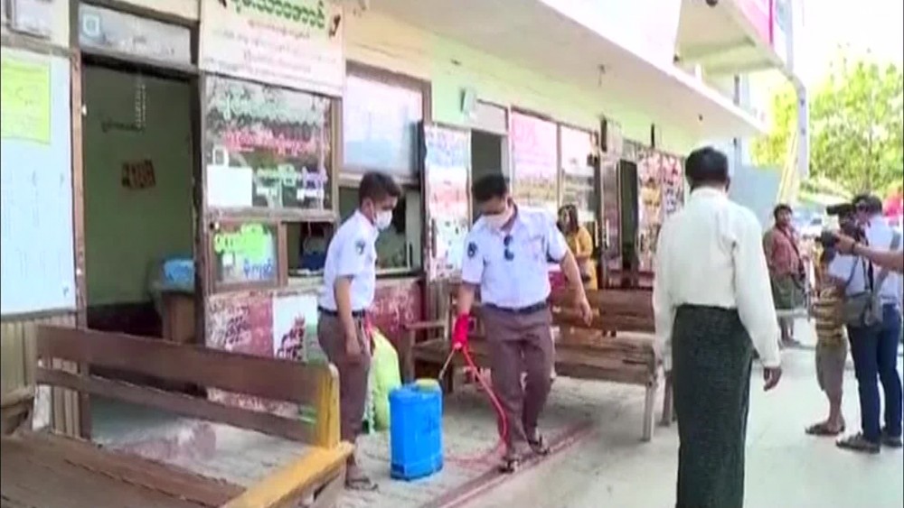 Precautionary measure such as antibacterial spraying is being performed at Pyay Gyi Myet Shin bus station in Mandalay and washing basins are arranged for the people for public awareness of the disease.