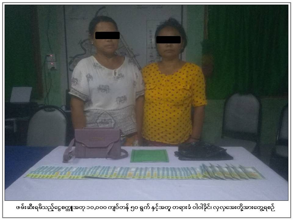 50 10,000-kyat counterfeit notes were seized in North Dagon Myothit, according to the Ministry of Home Affairs. The counterfeit note seizure in Yangon Region on Saturday afternoon led to an arrest of 2 women, Investigation is underway.