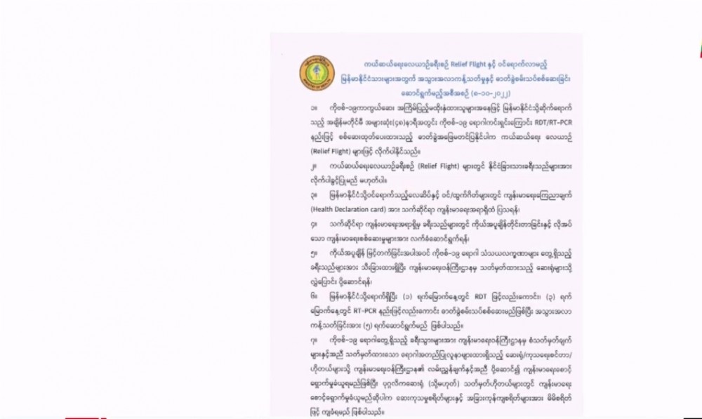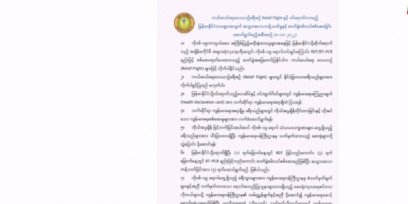 According to the Ministry of Health, Myanmar nationals abroad who have not received the full COVID-19 doses are required to show the laboratory test result confirmed by RTD/RT-PCR within 48 hours if they return to the country. Those who cannot show the test result are allowed to return only by relief flights. Although most countries no longer have relief flights, Myanmar still operates it. The main purpose of the relief flights is to bring the Myanmar nationals back to the country who are facing difficulties abroad due to various reasons, said director of the public health department.