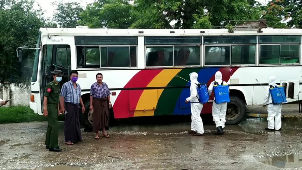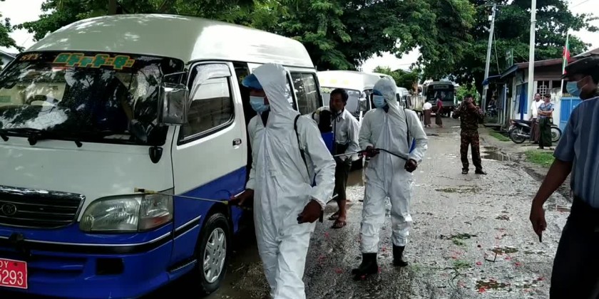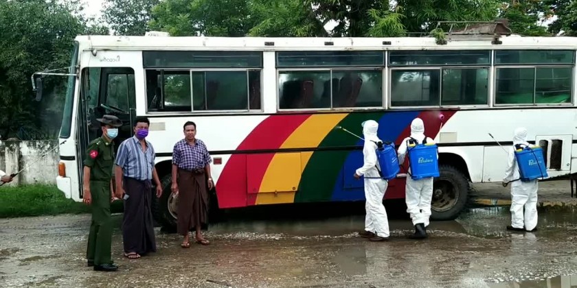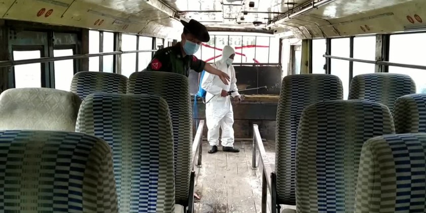 In Moe Meik Township of Shan State, the Township Bus Lines Administrative Committee conducted disinfectant spraying to all highway passenger buses with the support of the local military battalion on 10th June.